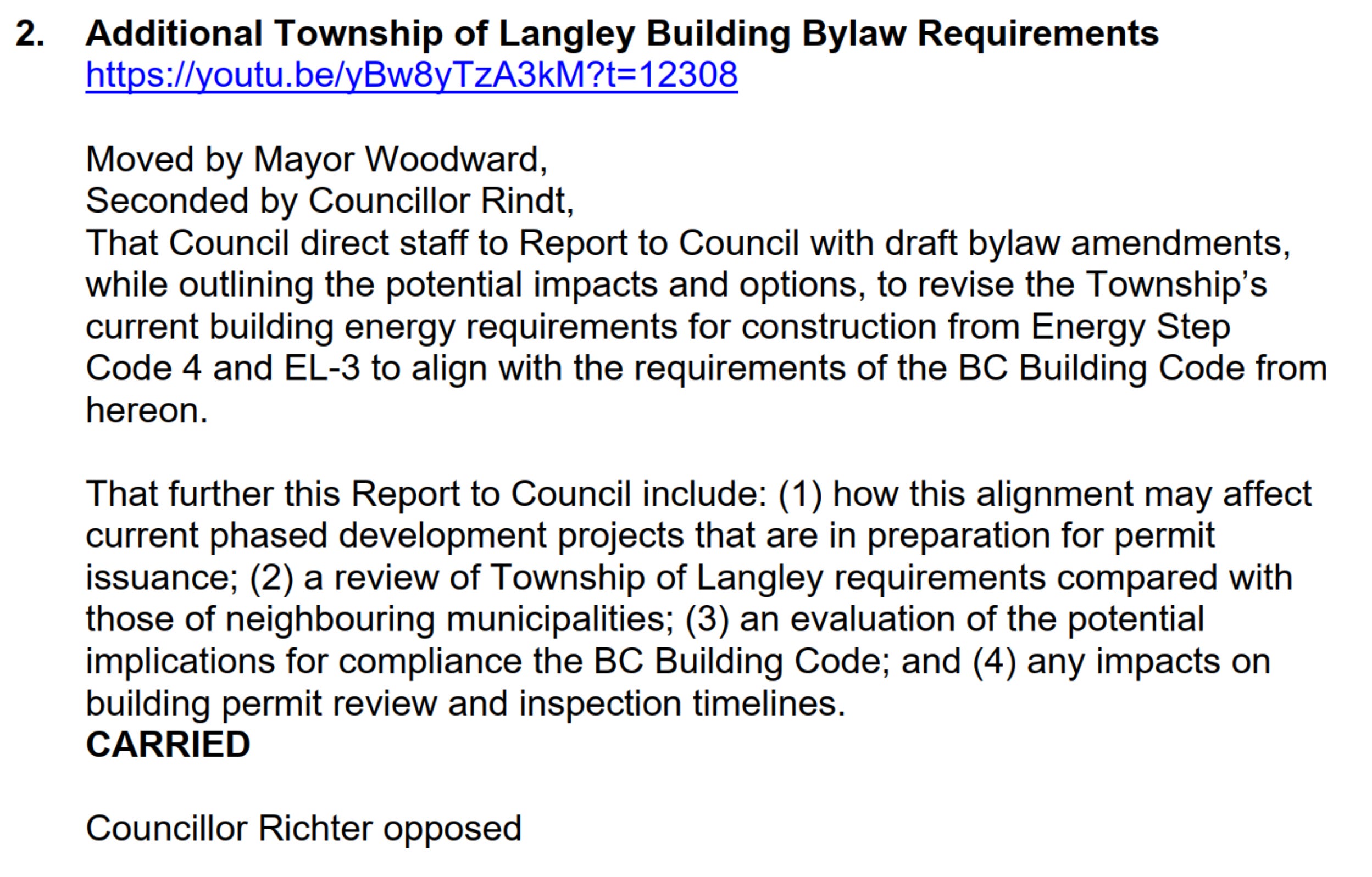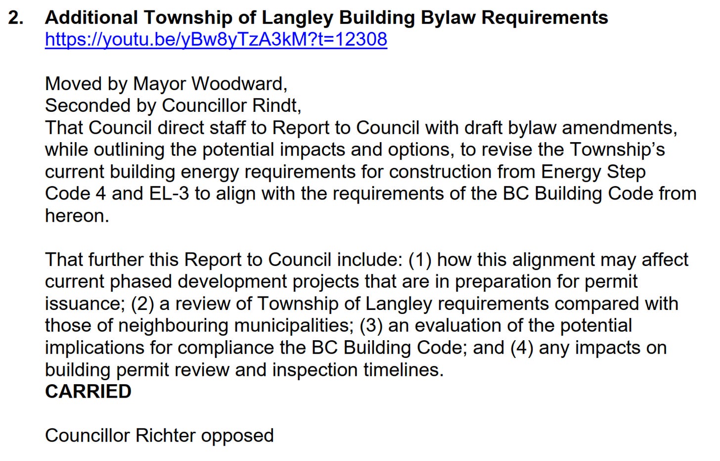 However, we learned that at the July 7th 2025 council meeting, an unusually worded motion was carried that asked staff to, in essence, rollback both Step Codes that had been previously implemented, described as aligning with the BC Building Code.