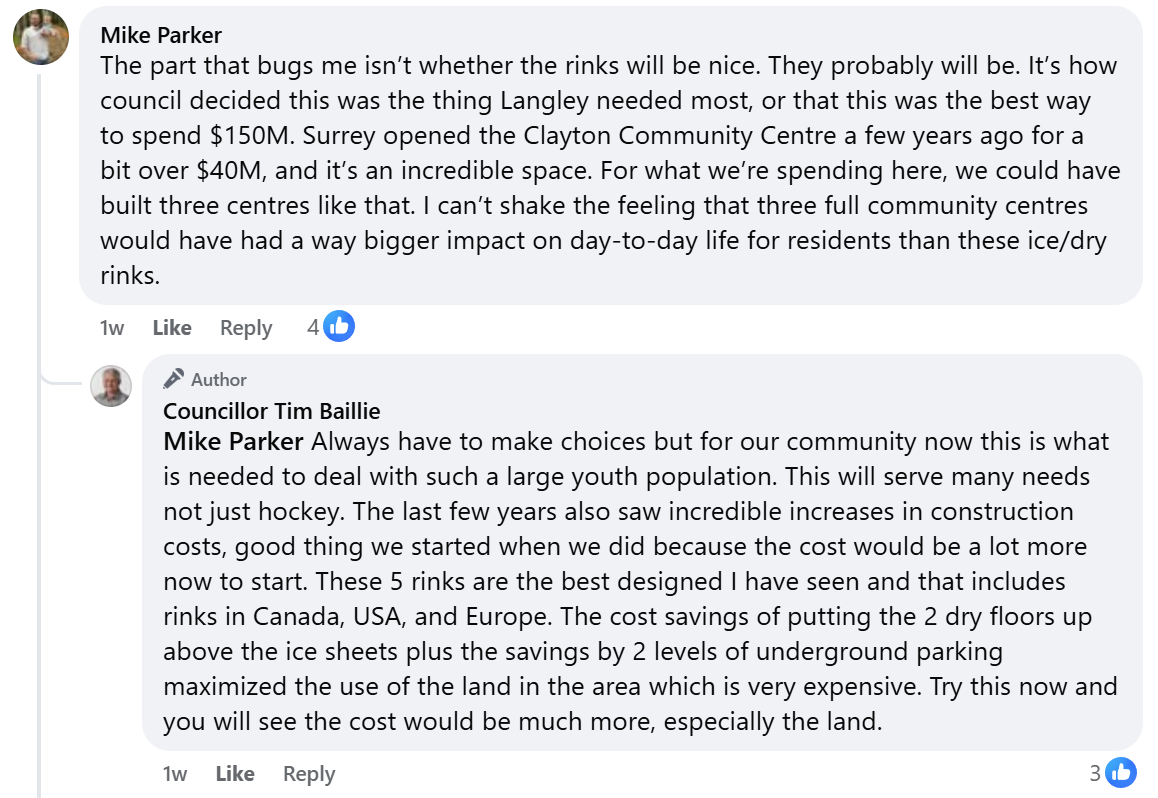 I asked Councillor Baillie a straightforward question about why 5 Rinks was prioritized when families in Willoughby, for example, would benefit more from a library or community center.